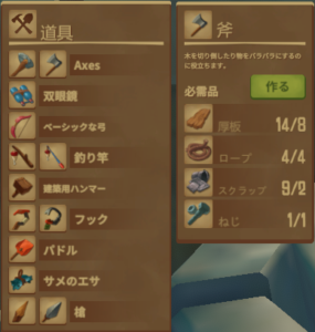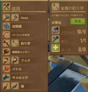 アイテムはまずフックと釣り竿、斧をいいものに変えましょう。